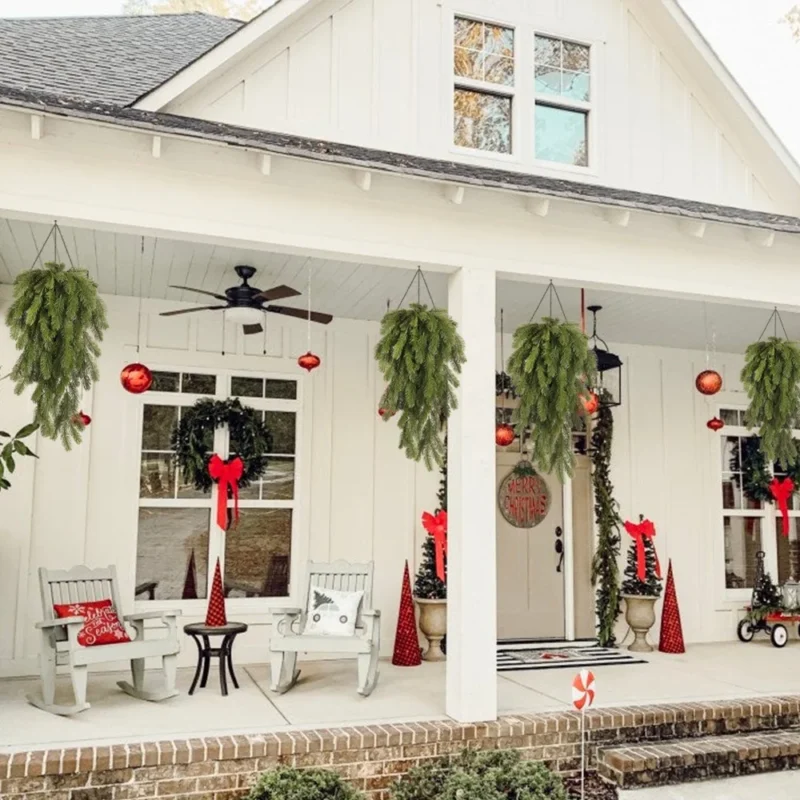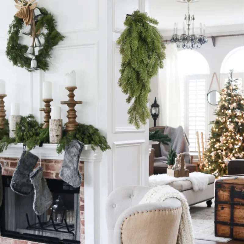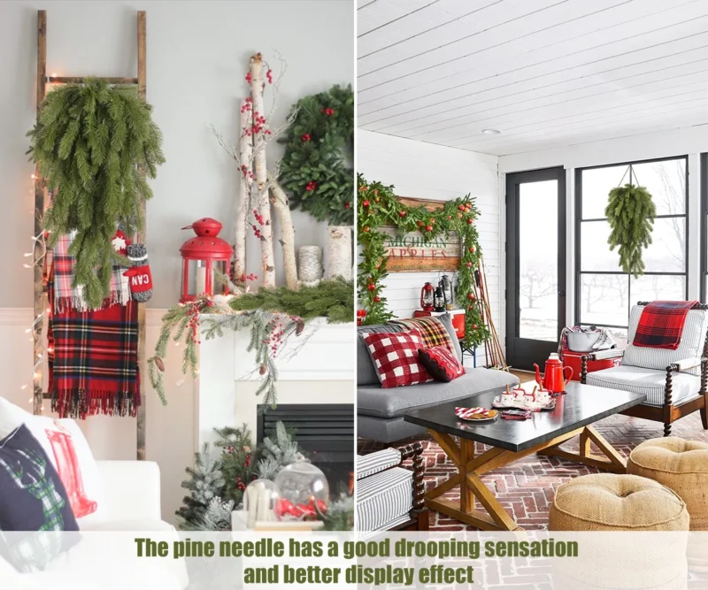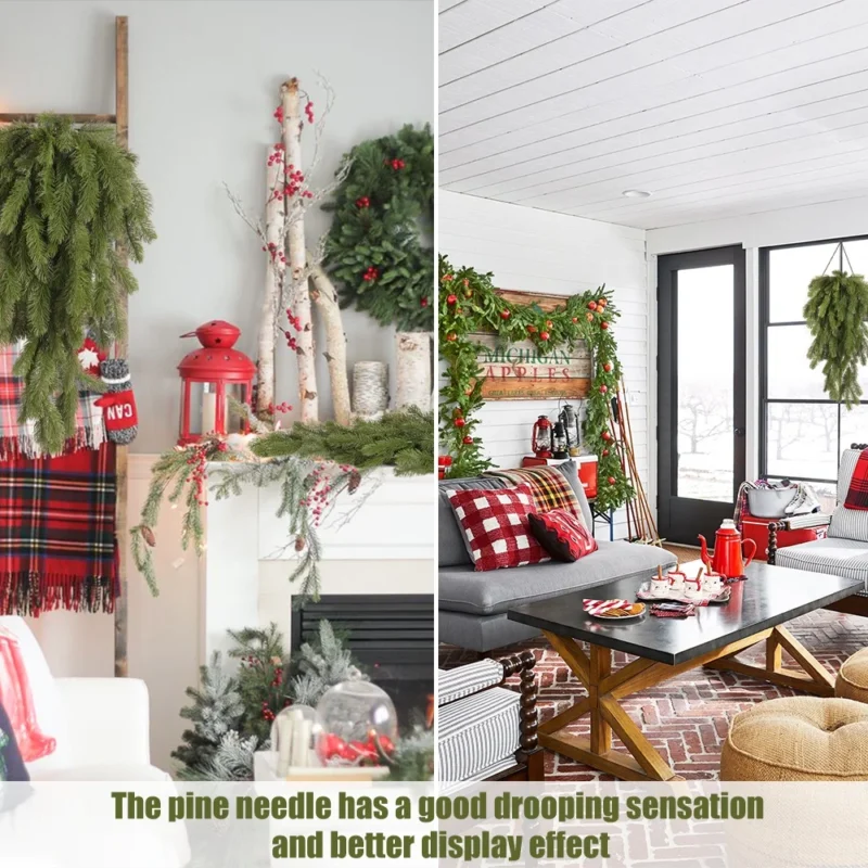 Christmas hanging pine needles are the perfect Christmas decoration for your home. These realistic hanging pine needles are made of high-quality artificial materials and are available in three different colors to suit your preference. They are versatile and can complement any Christmas theme or decoration, whether it is a Christmas tree display, pine wreath, floral arrangement, or as decoration on furniture and doors. Creating a festive atmosphere in your home this holiday season.