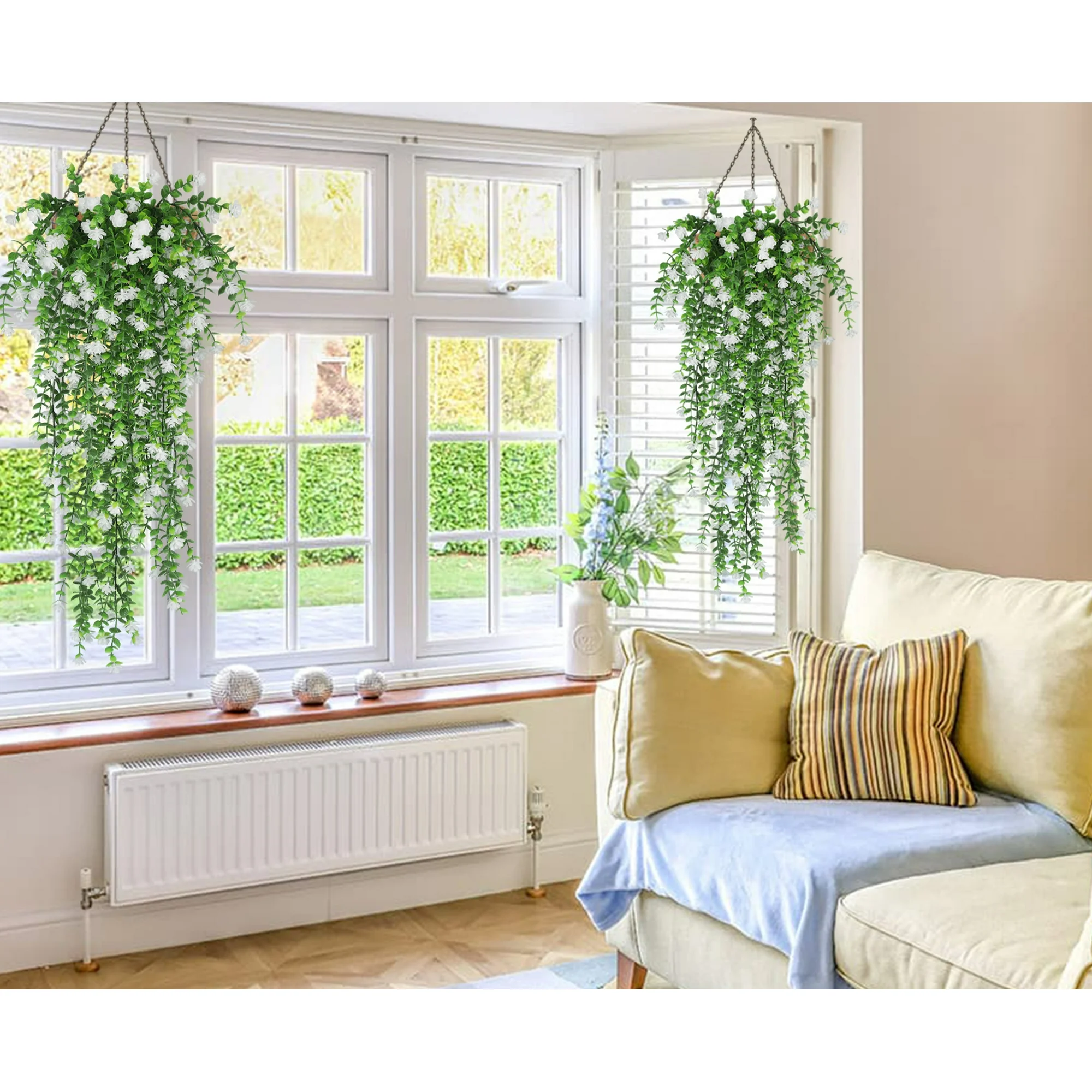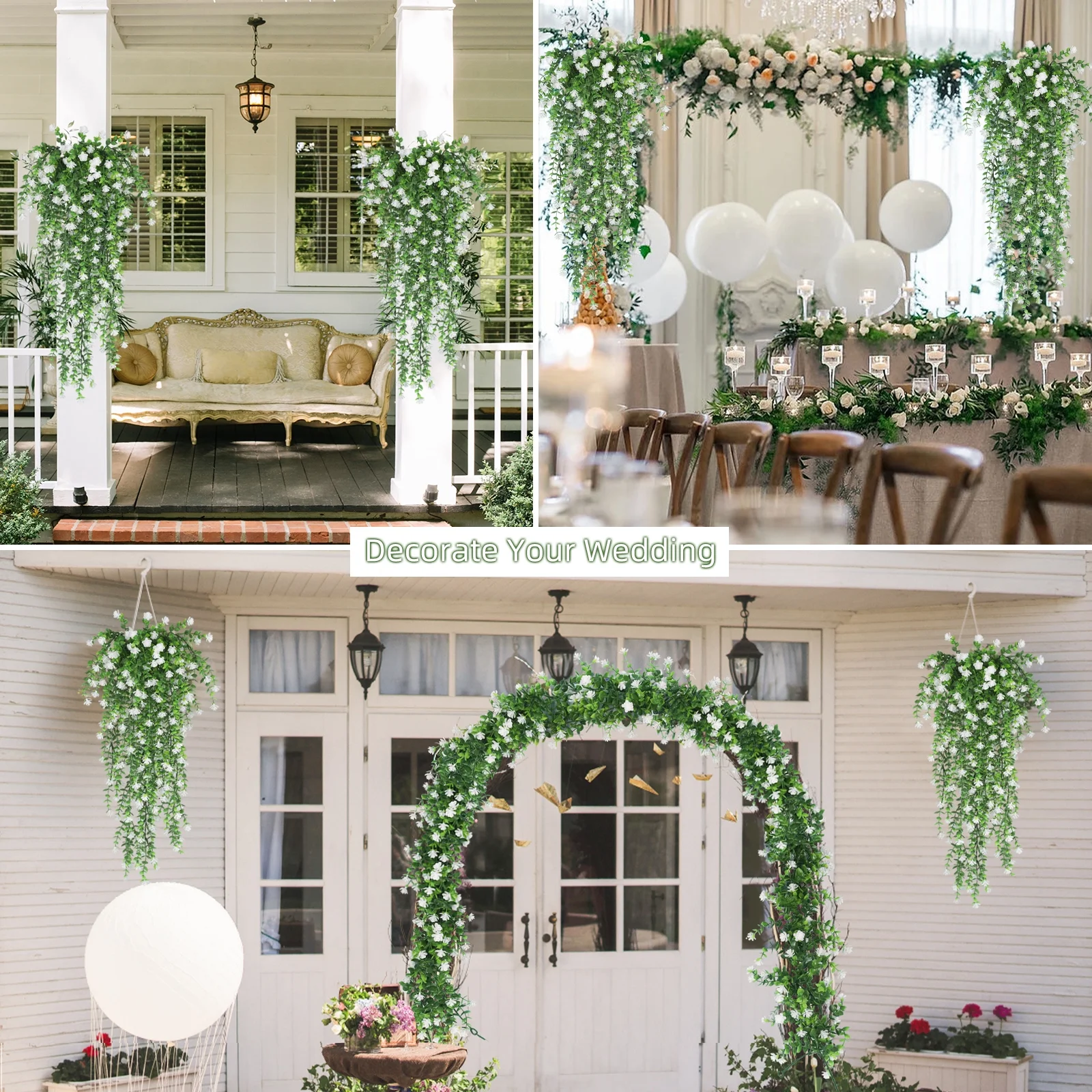 RECUTMS Artificial hanging plants vine are suitable for outdoor indoor wedding party festivals.Fake vine plant can be hung in the living room, corridors, porches, cafes, stairs, outdoor garden house decoration.Lifelike Outdoor fake hanging plants arrangement are match everywhere of your home,adds a touch of nature to your space.