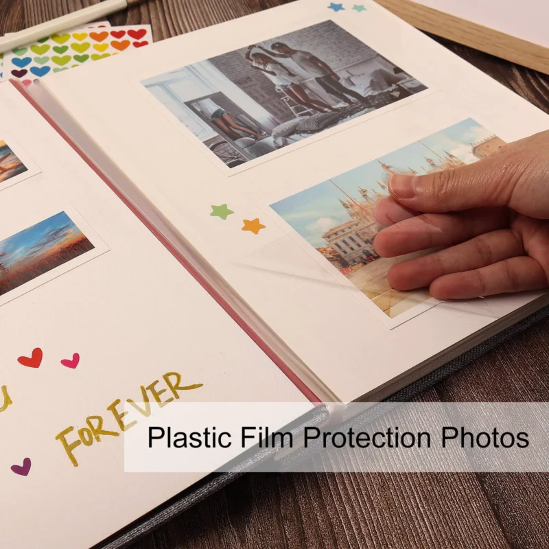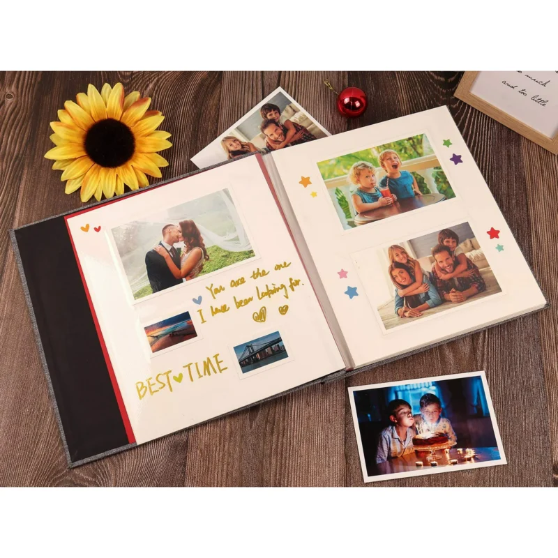 Self adhesive scrapbook is made of high-quality cotton and linen,Hold 120 6×4 photos,material is polyurethane film,which has the characteristics of anti-scratch,It can protect the photo while flexibly adjusting the position.You can use the included pen to scribble on the album film as you like,The page can DIY, record our own unique memory photos, The photo can write time, place, and take pictures. Wait until we open it again. It is also a good memory. This is a very precious collection.